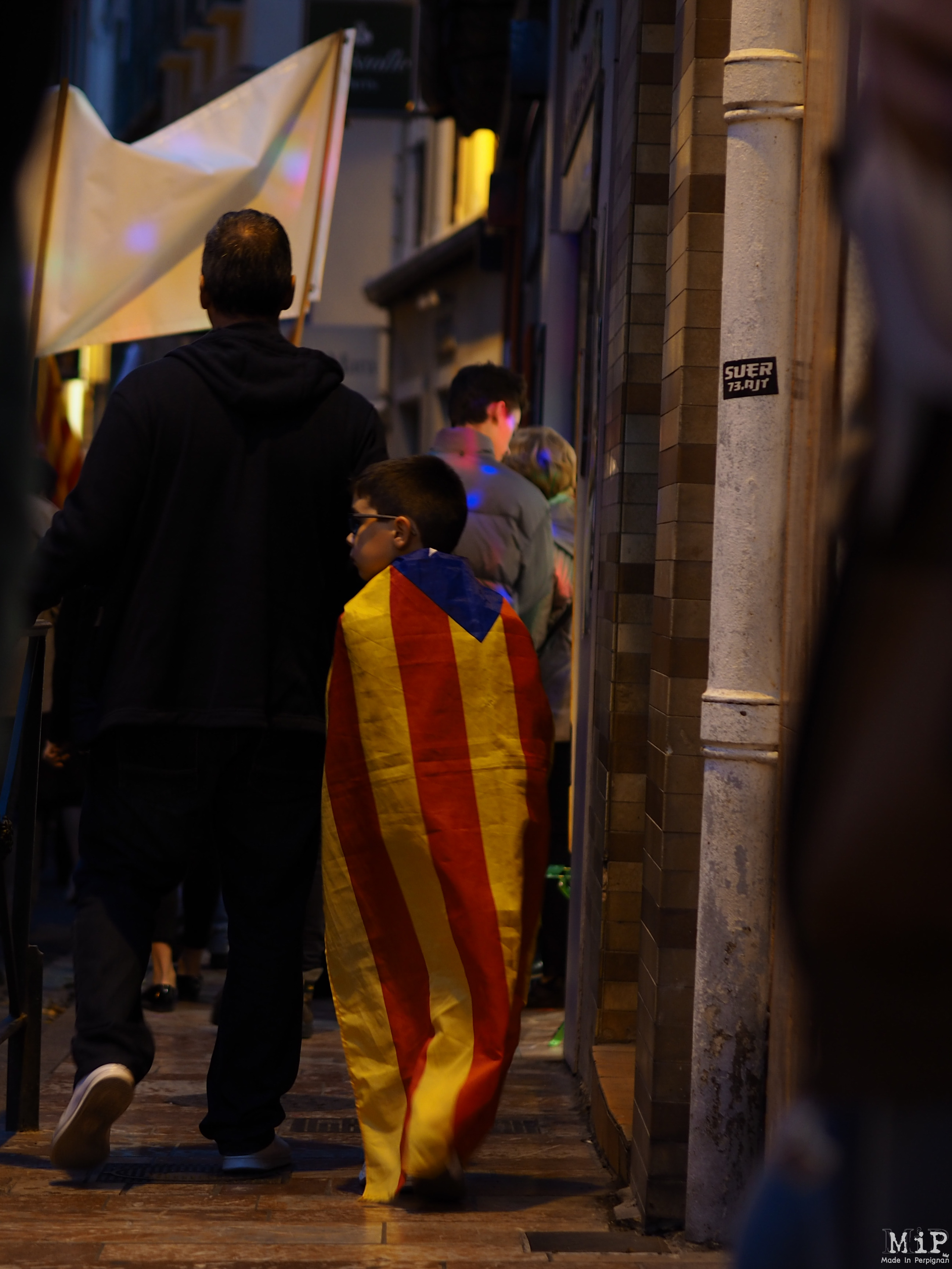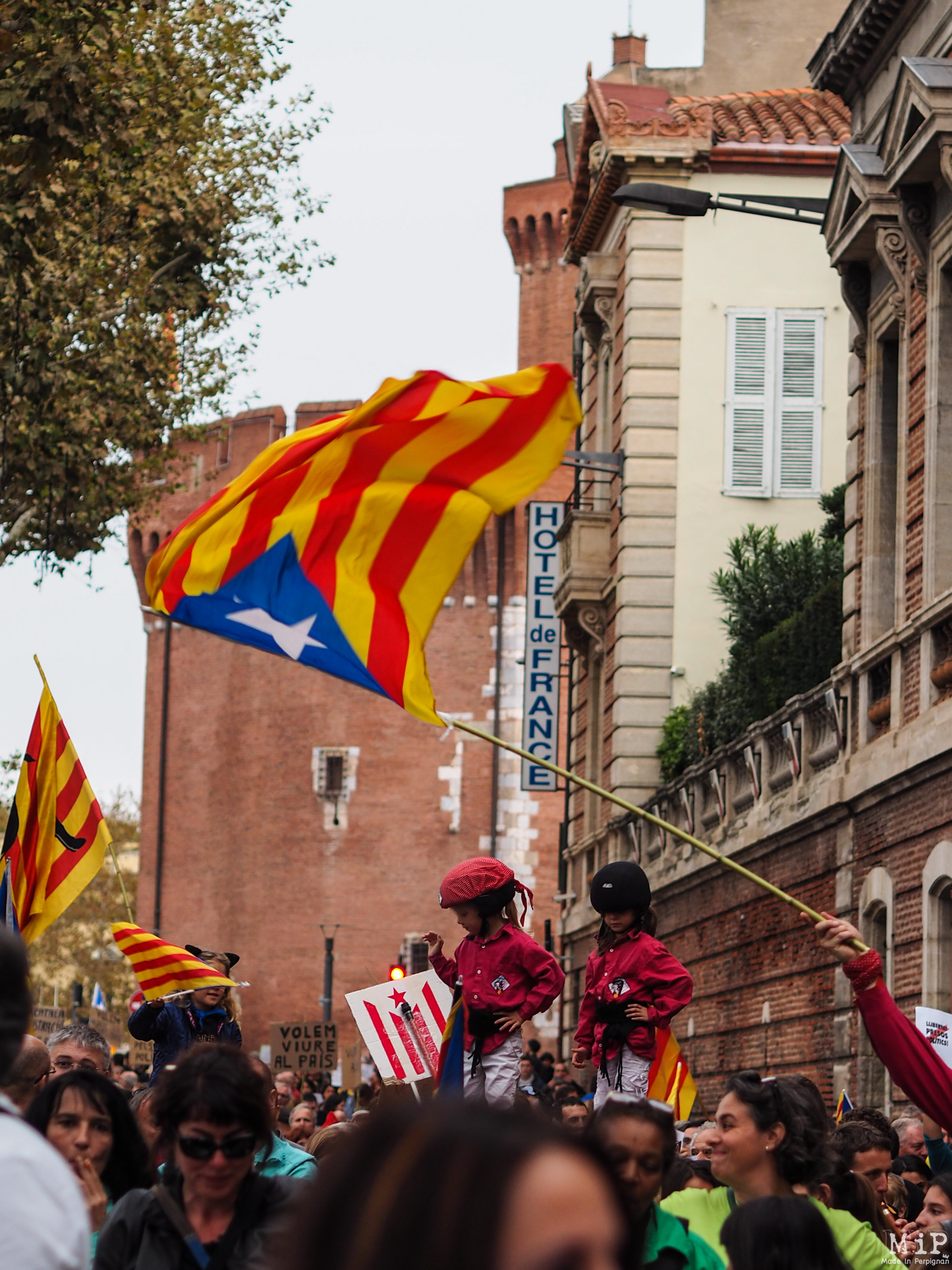 Les « Diables du Conflent » et leurs « Correfocs », les jeunes hommes parés d’un costume de diable, devançaient le cortège de manifestants avec le feu au bout de leur pique. Tandis que les Castellers, ces châteaux humains érigeaient leur pyramide humaine « en signe de la solidarité envers leurs cousins catalans du sud ».